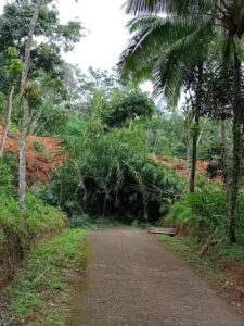 Tebing setinggi sekitar 50 meter tiba-tiba runtuh dan menutup total jalan penghubung utama warga. Sebelumnya, tanda-tanda sudah terlihat sejak pagi, mulai dari kerikil berjatuhan hingga retakan tanah yang semakin melebar ditambah dengan adanya curah hujan yang lumayan tinggi. Hingga akhirnya, longsor besar tak terhindarkan.